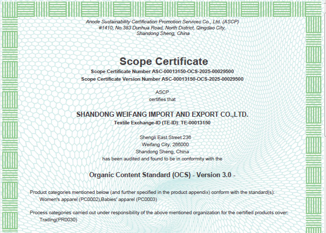 公司自營(yíng)和代理服裝、食品、五金、化工、機(jī)電等各類(lèi)商品及技術(shù)的進(jìn)出口業(yè)務(wù),公司有專(zhuān)門(mén)的生產(chǎn)、加工基地,并通過(guò)了Oeko - Tex Standard 100、GRS、OCS、RCS、USCTP等多項(xiàng)認(rèn)證,可以按客戶要求設(shè)計(jì)生產(chǎn),同時(shí)承辦中外合資經(jīng)營(yíng)、合作生產(chǎn)、開(kāi)展“三來(lái)一補(bǔ)”以及技術(shù)輸出、易貨、邊境貿(mào)易等業(yè)務(wù)。公司產(chǎn)品出口到日本、法國(guó)、俄羅斯等50多個(gè)國(guó)家或地區(qū)。